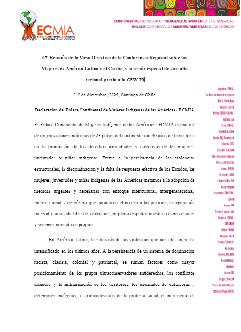 Declaración ECMIA - 67a Reunión de la Mesa Directiva de la Conferencia Regional sobre las Mujeres de América Latina y el Caribe, y la sesión especial de consulta regional previa a la CSW70